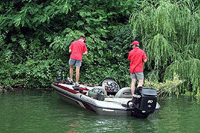 Ils ont mis en oeuvre deux techniques. La première a consisté à pêcher au leurre souple dans les branches (comme tout le monde ou presque), principalement avec des Power Worm Berkley et des petites écrevisses Yamamoto. Plutôt qu'un hameçon texan + balle, ils ont privilégié un montage sur têtes plombées spéciales Decoy et Owner (avec hameçon texan), qu'ils ont pitché (lancé en douceur sous la canne) dans les moindres trouées.